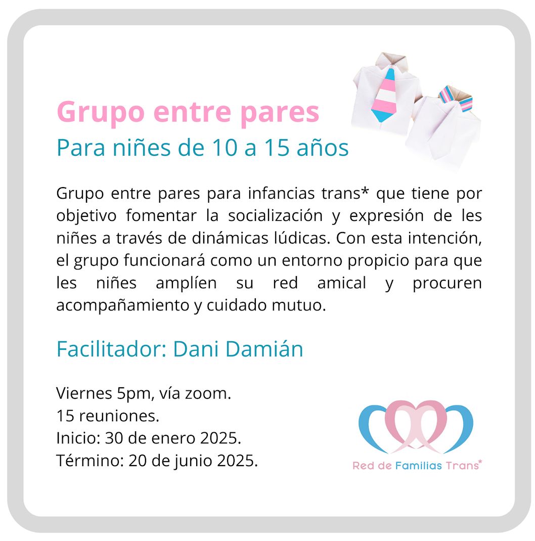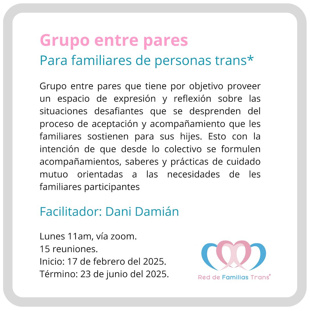 Soy colaborador de la Red de Familias Trans* desde su fundación y formé parte de su coordinación durante sus primeros dos años. A través de esta organización he facilitado una amplia diversidad de grupos entre pares para infancias y adolescencias trans*, así como para sus familiares.